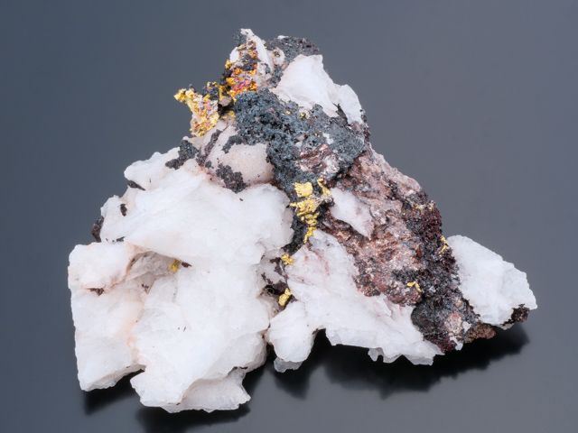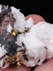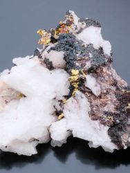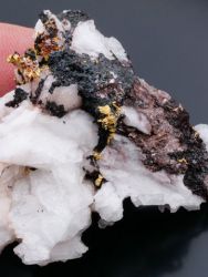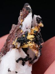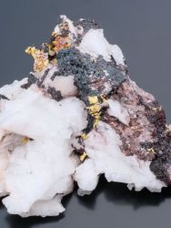 This piece features a thick, sturdy, brilliantly-colored group of gold crystals perched dramatically on a knoll of quartz.This piece features a thick, sturdy, brilliantly-colored group of gold crystals perched dramatically on a knoll of quartz. It is very aesthetic. It is complete and showy on one side.