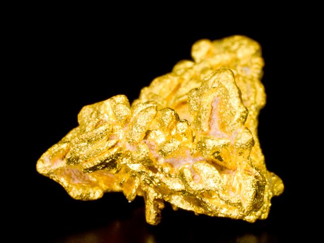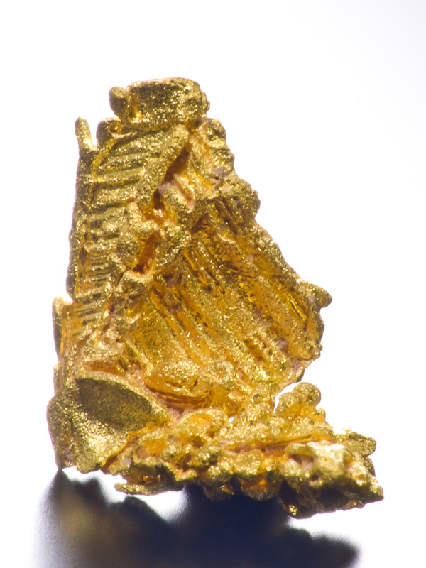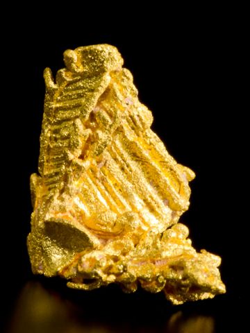 This fine gold specimen (3.7 g) is out of a completely new find from 2015 that has rapidly made a name for itself as a source for world class gold specimens.This fine gold specimen (3.7 g) is out of a completely new find from 2015 that has rapidly made a name for itself as a source for world class gold specimens. Best color, filigree growth and a vibrant sheen are trademark for this locale. No damage. With hoppered growth, sharp crystals and a 3-dimensional structure this is a brilliant example for the high quality of Brazils new gold deposit - one that has already been closed by police forces just several months after its discovery.