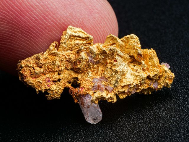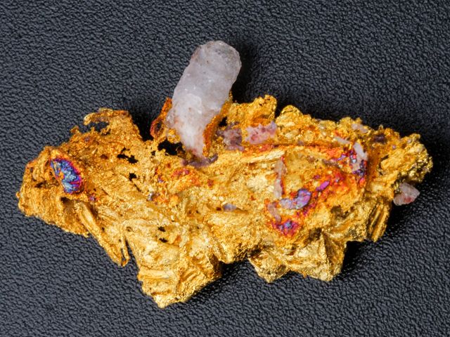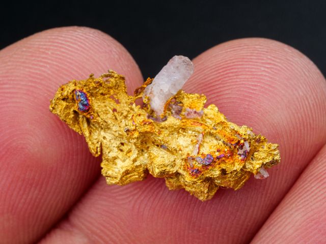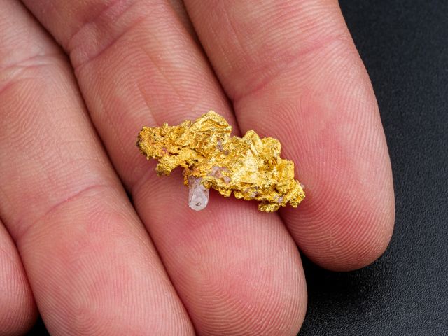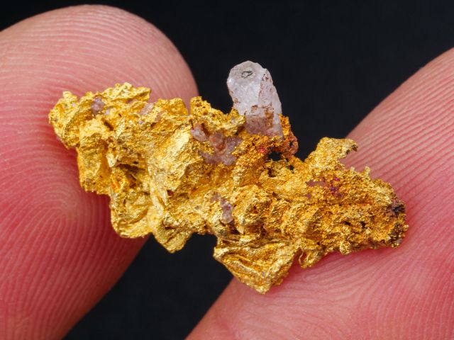 Velmi hezký vzorek ryzího zlata s krystalem křemene z nového nálezu na lokalitě Aouint Ighoman v Maroku. Seskupení lesklých krystalů zlata dosahuje velikosti 2,2x1,15x0,6 mm.Velmi hezký vzorek ryzího zlata s krystalem křemene z nového nálezu na lokalitě Aouint Ighoman v Maroku. Seskupení lesklých krystalů zlata dosahuje velikosti 2,2x1,15x0,6 mm. Váaha 2,46 g.