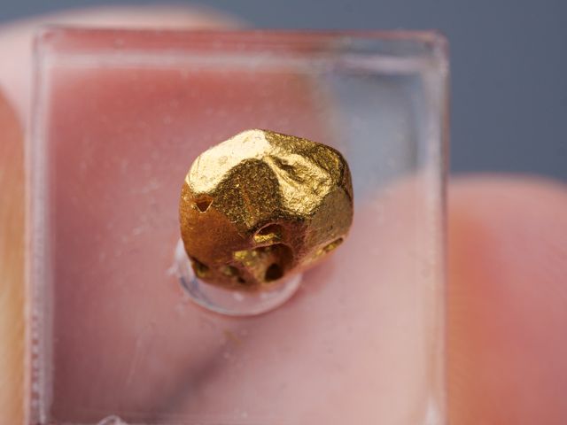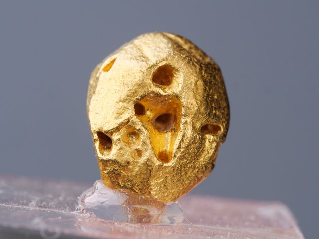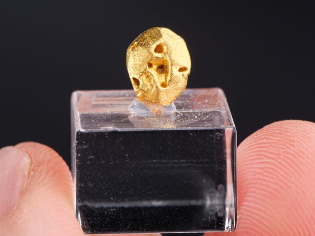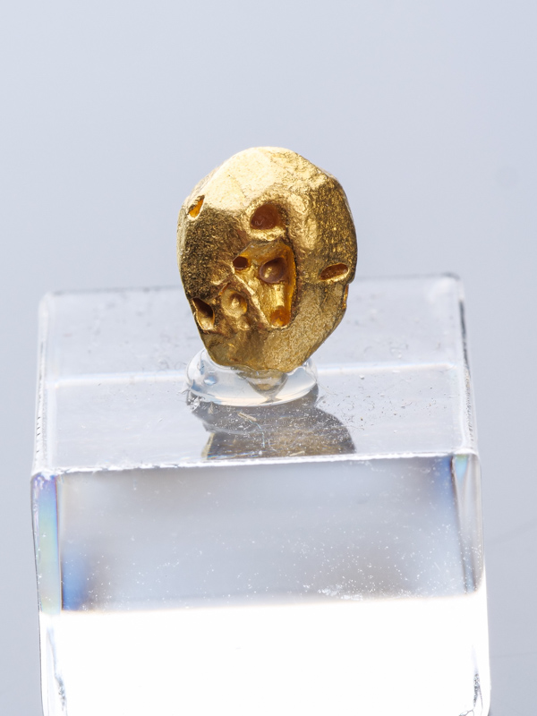 Vzorek krásně krystalovaného zlata (1.32 g) z venezuelské lokality Ikabaru. Nugety zlata jsou zřídkakdy krystalovány v zachovalé podobě (vzorky bývají ohlazeny). Tento luxusní zlatý vzorek má viditelné krystalové hrany viditelné ze všech pohledových stran. Investiční vzorek na podstavci z Venezuely.