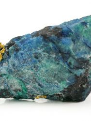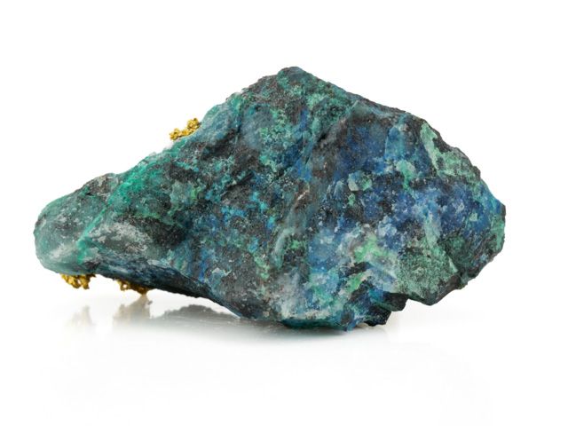 Very nice specimen of shattuckite loaded with leaf and vein Gold. The largest grain showing is 12 mm across. Nice piece, sits well.