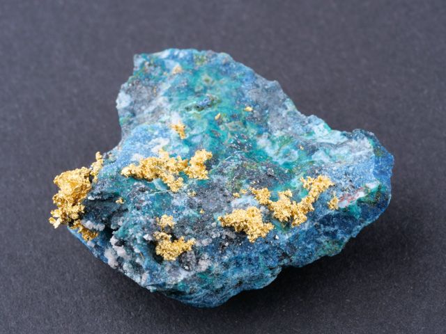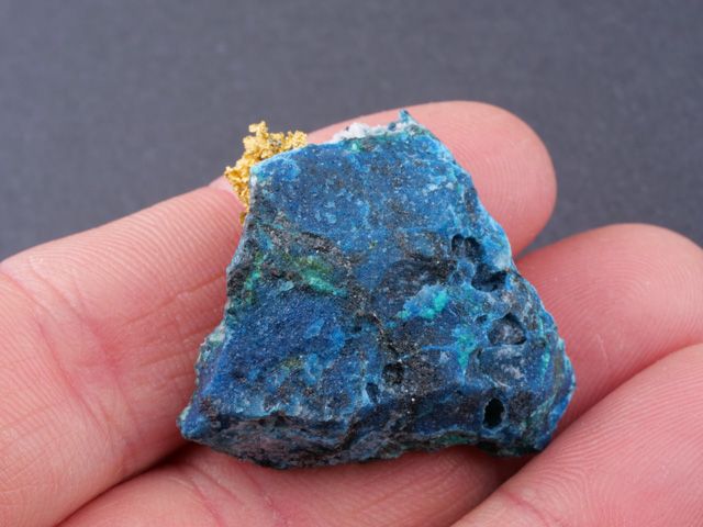 Very nice specimen of shattuckite loaded with leaf and vein Gold. The largest grain showing is 10 mm across. Nice piece, sits well.